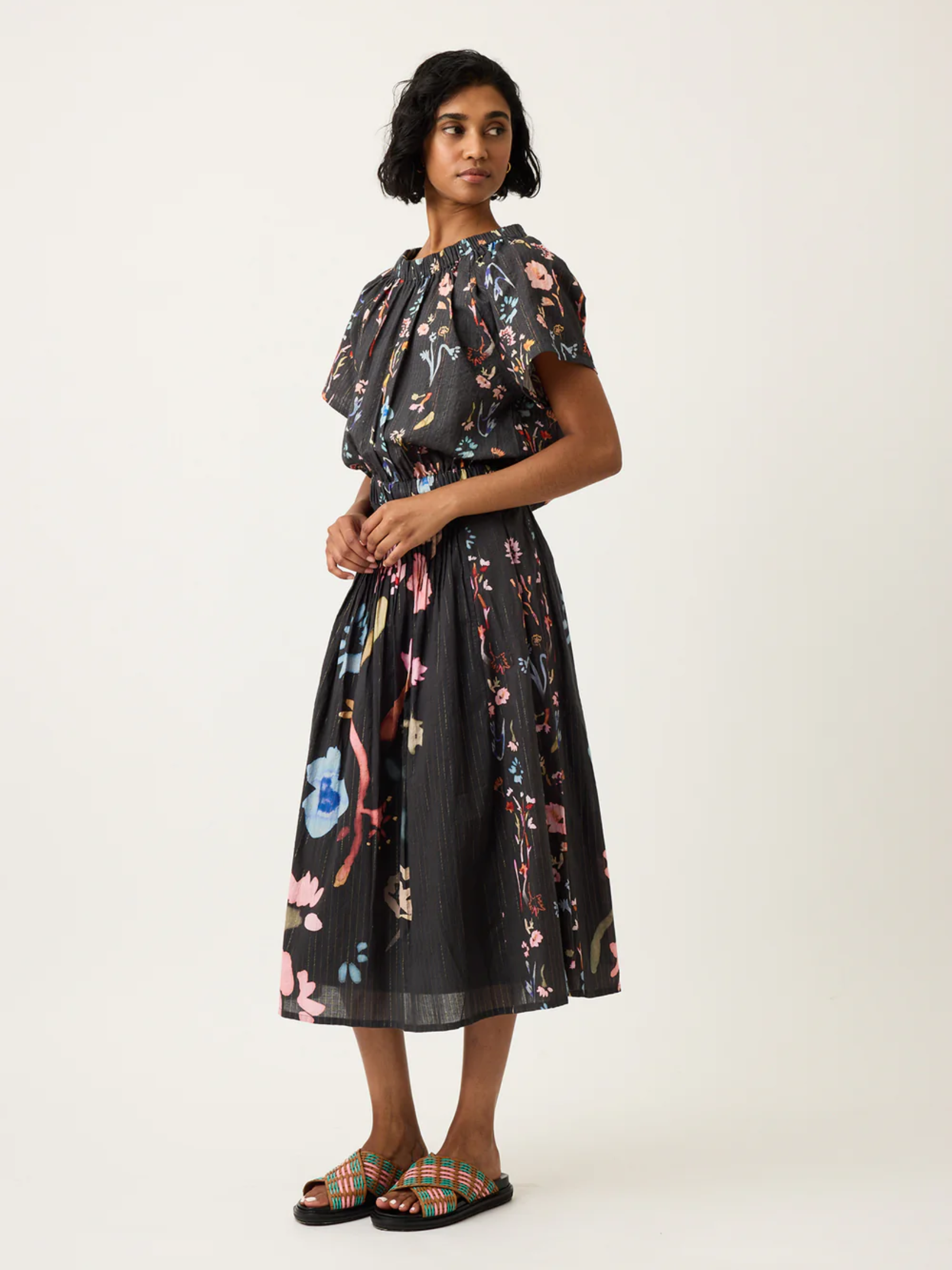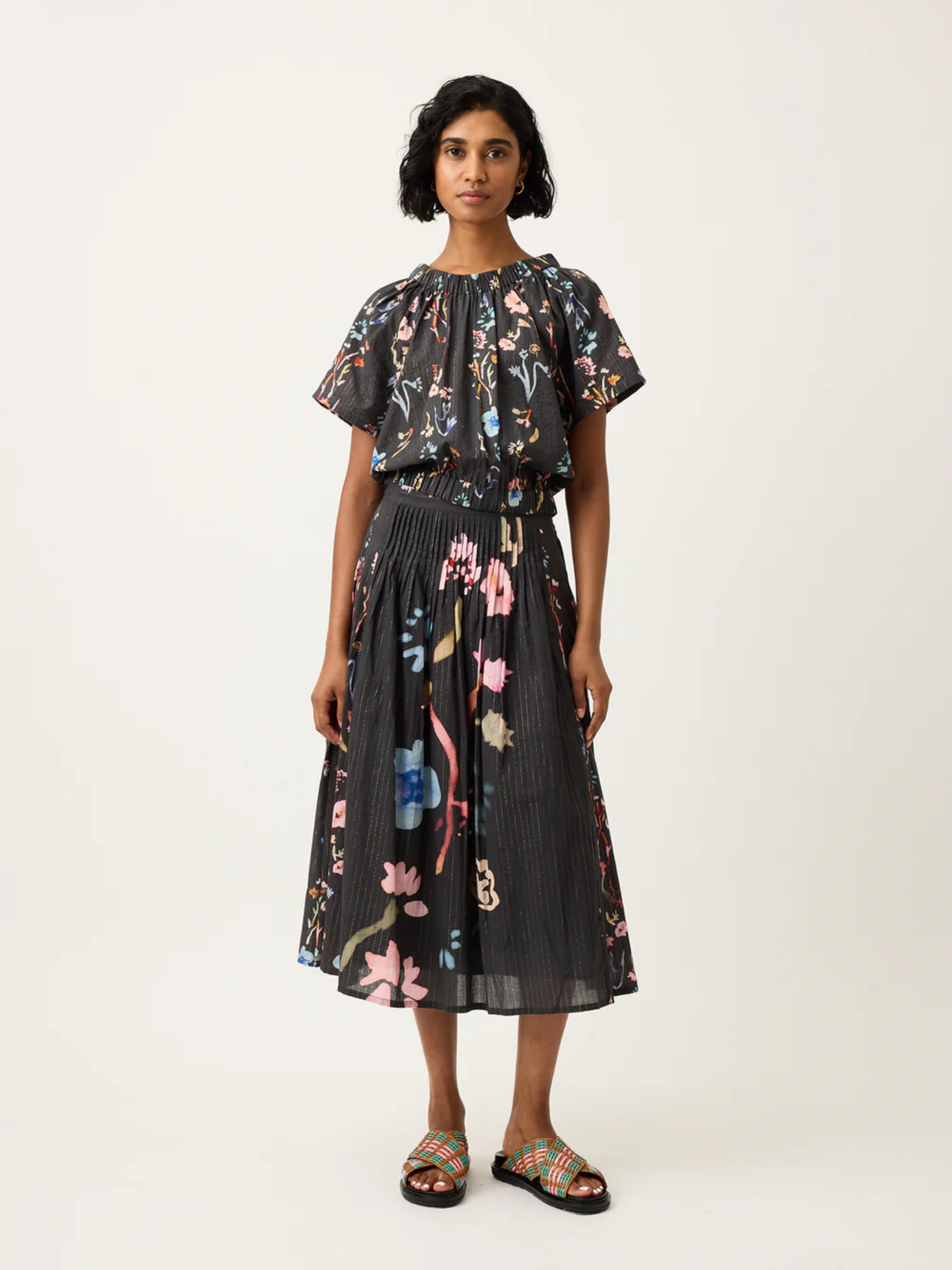 The Alma Yoke skirt in soft cotton with a subtle lurex golden stripe and delicate pintucks.