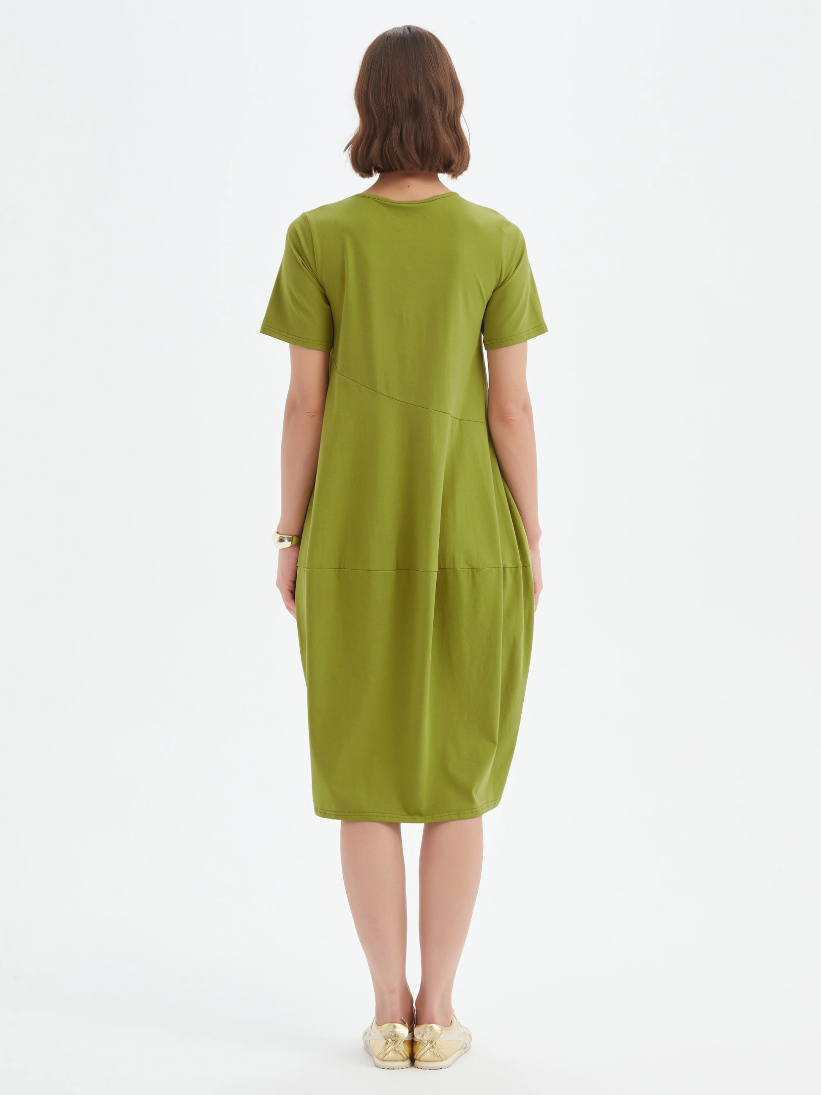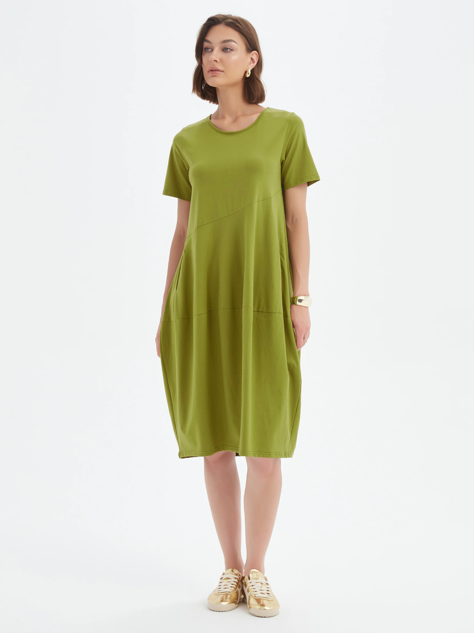 An effortless update to a Tirelli classic. The Short Sleeve Diagonal Seam Dress is crafted in an improved cotton jersey with a softer handfeel and enhanced drape. Designed with short sleeves, a midi length, and our signature diagonal seam, it’s finished with a relaxed balloon skirt and practical side pockets - a breathable women’s dress for easy, everyday style.