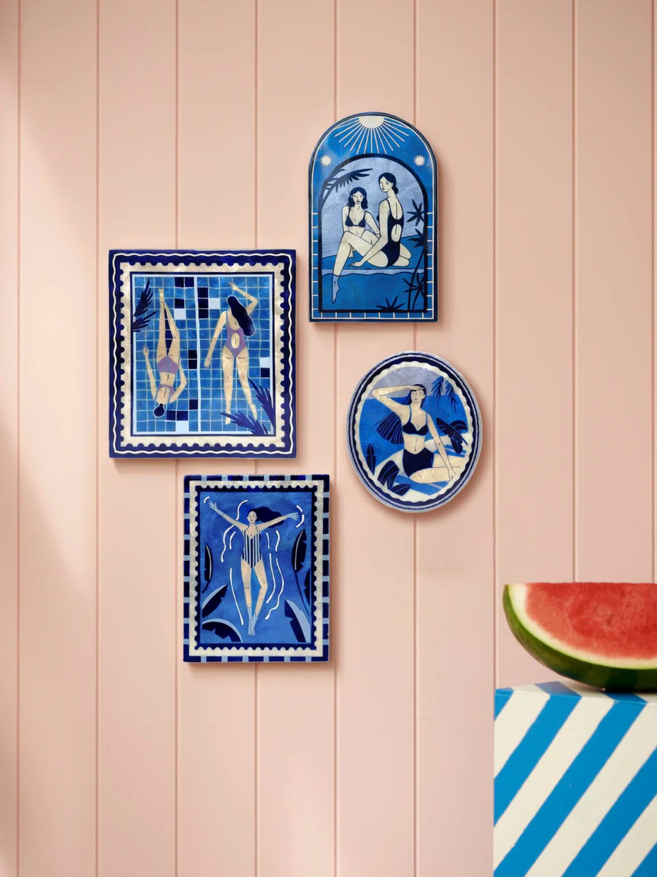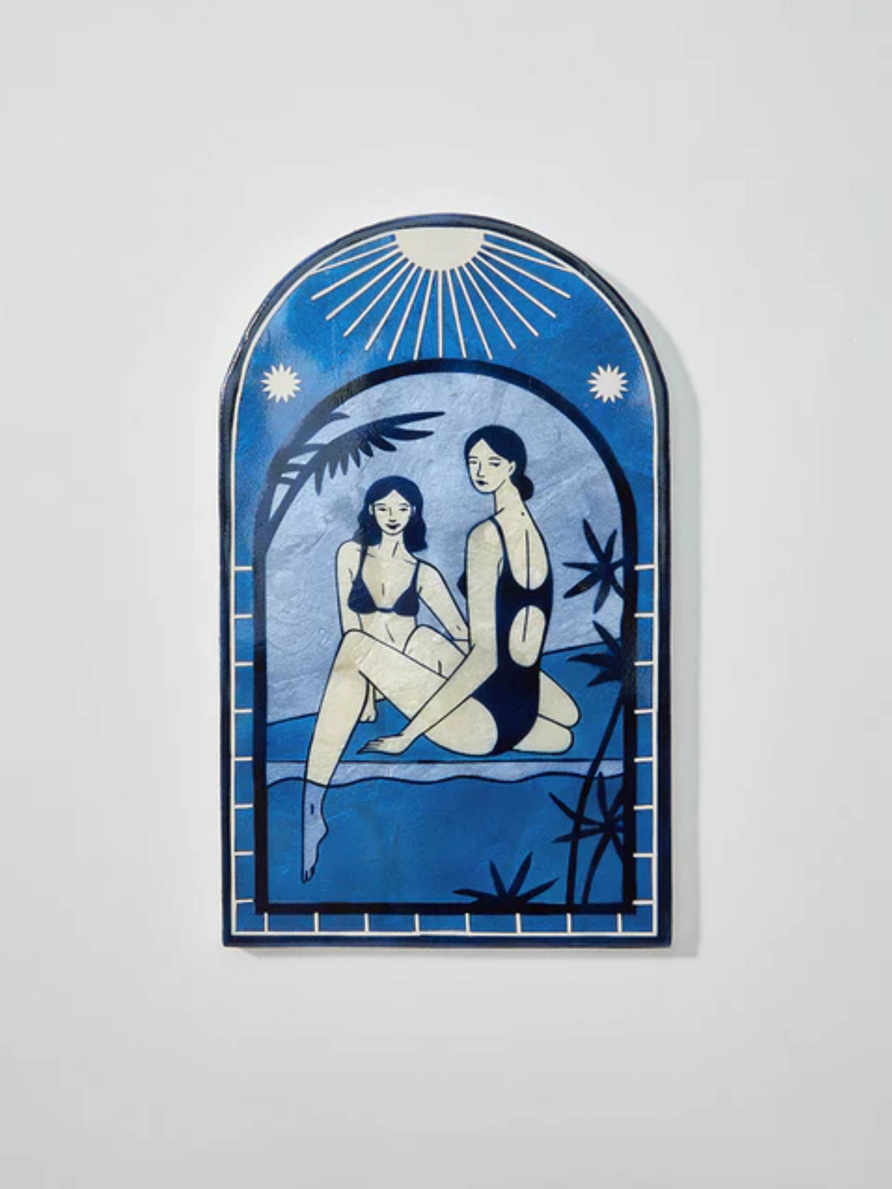 Introducing our captivating Resort Wall Art series, where swimsuit clad women bask in the shimmering ambiance of a glamorous hotel resort pool. Each piece is hand-painted on authentic capiz shell from the Philippines, making every artwork a unique piece. With these alluring designs, you can bring the essence of luxurious leisure to your home. Dive into a world of sophistication and relaxation as you adorn your walls with these, one-of-a-kind creations.