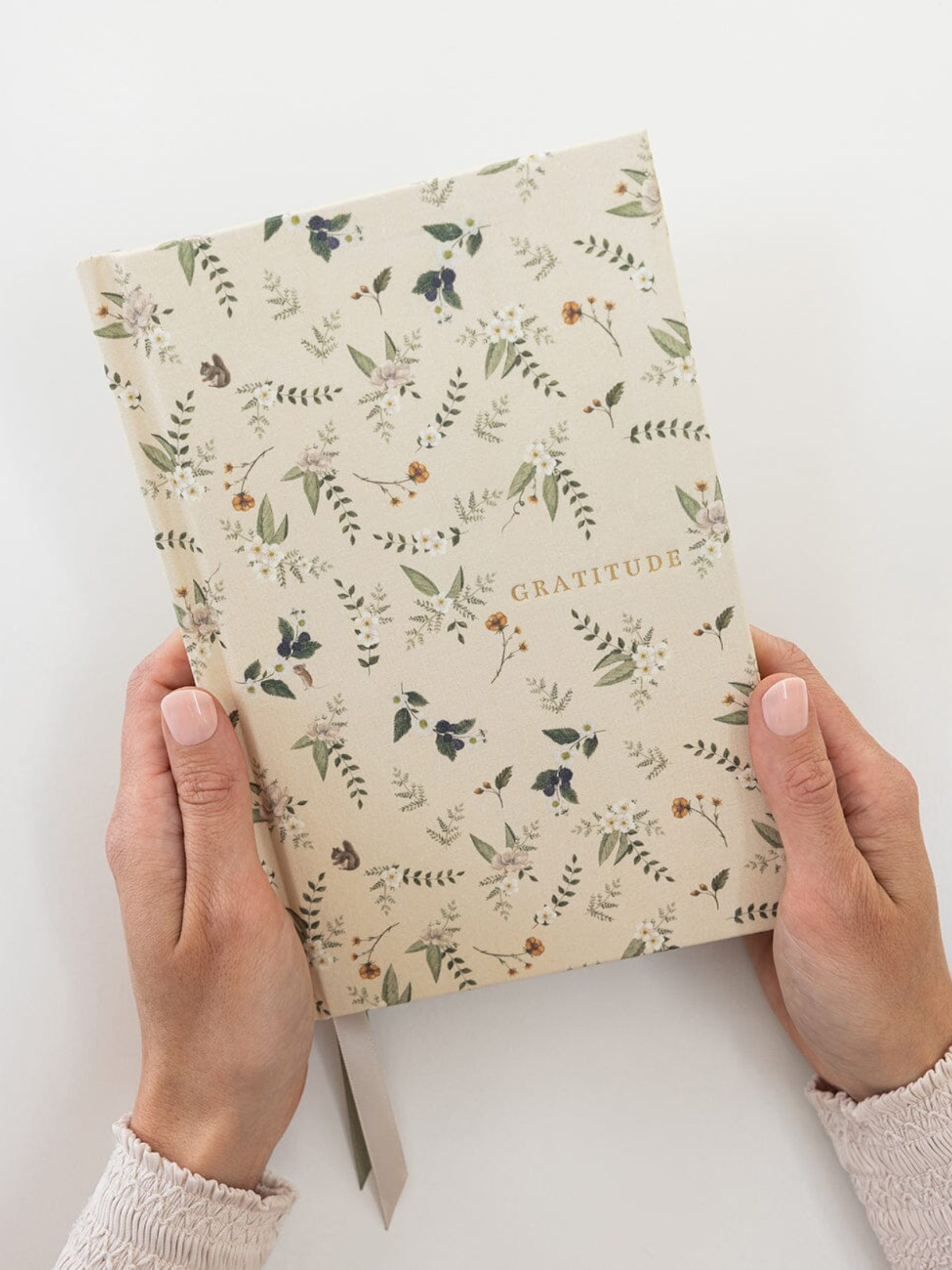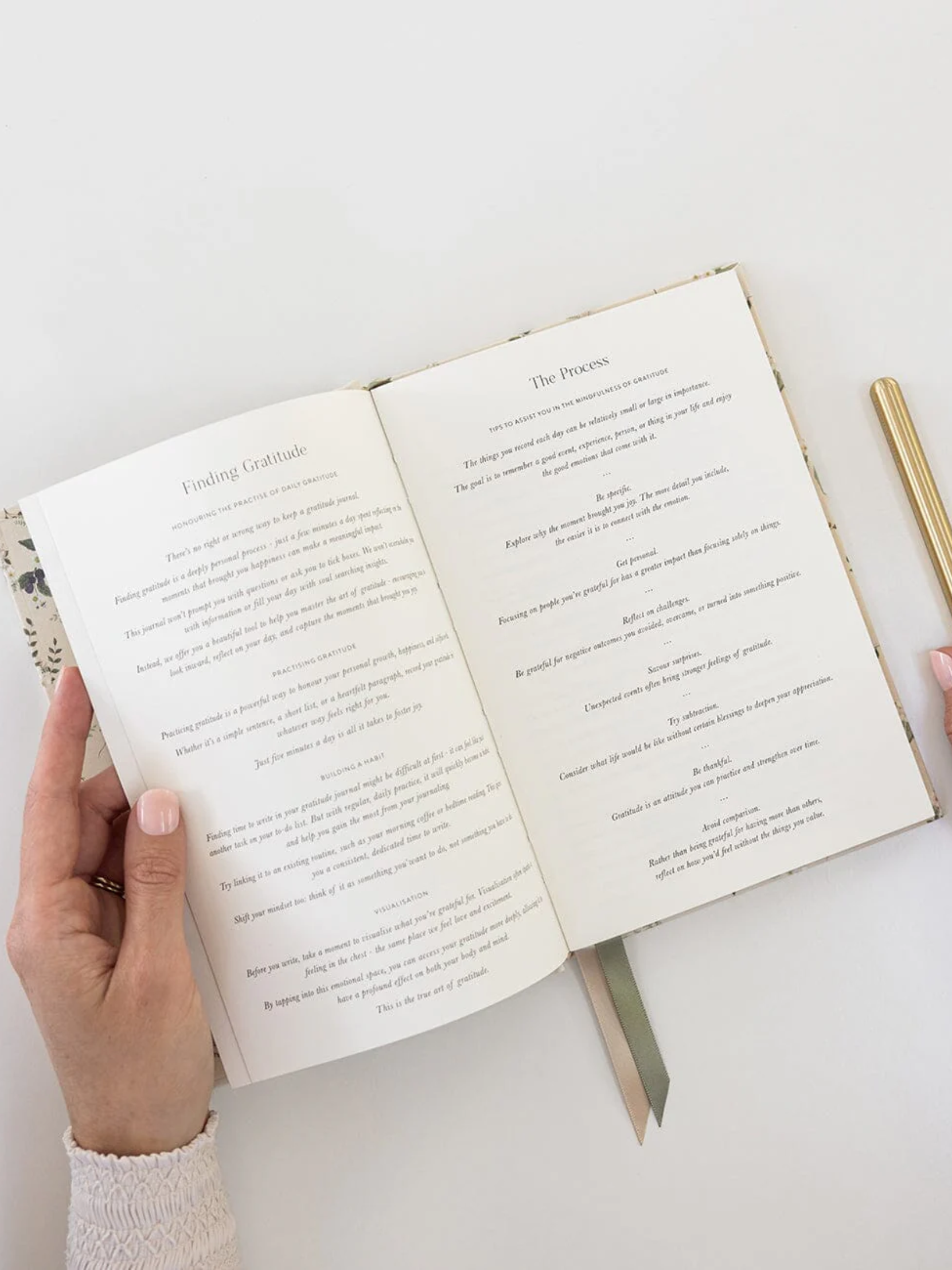 The beautiful linen-bound gratitude journal from Bespoke Letterpress, featuring gold foil printing, gilded edges, decorative covers, and satin ribbon markers, offers 112 pages of chlorine-free paper.