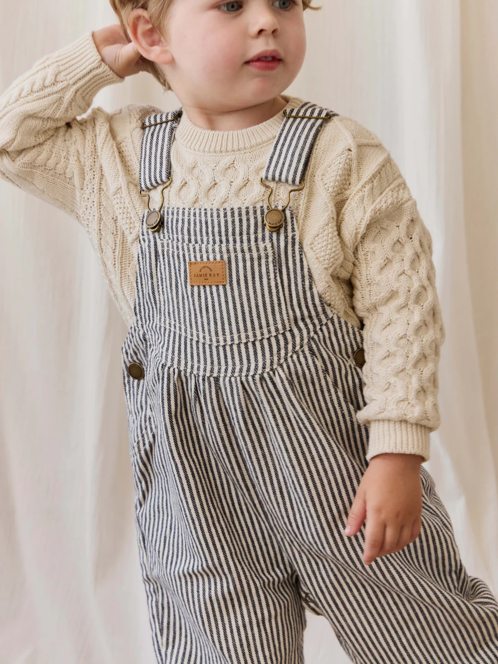 A timeless piece for your little boy’s wardrobe, the Cecil Overall features a classic nautical-inspired stripe design in deep eclipse and soft cloud tones. Perfect for layering over tees or knits, this overall is ideal for playtime and everyday adventures.