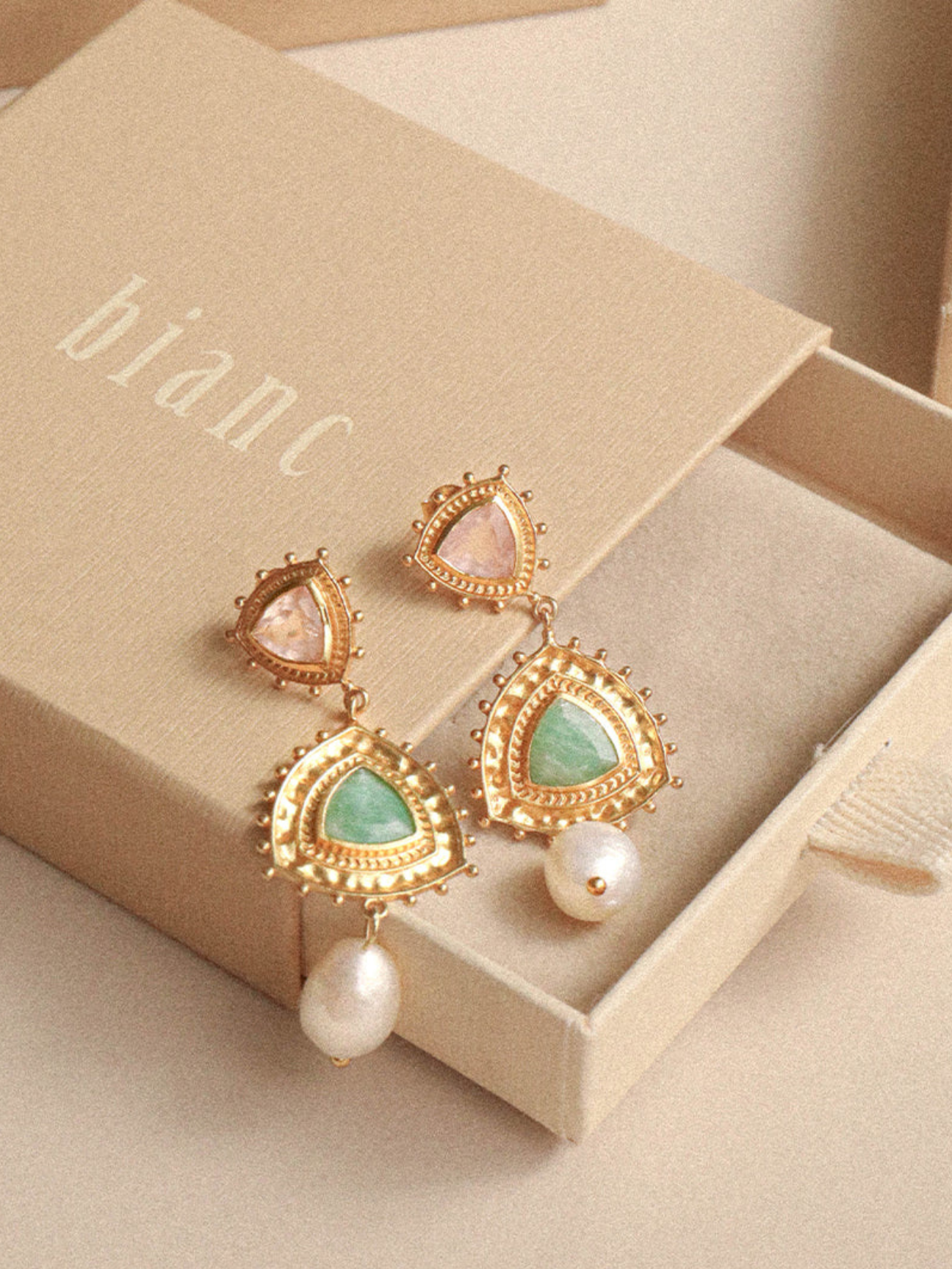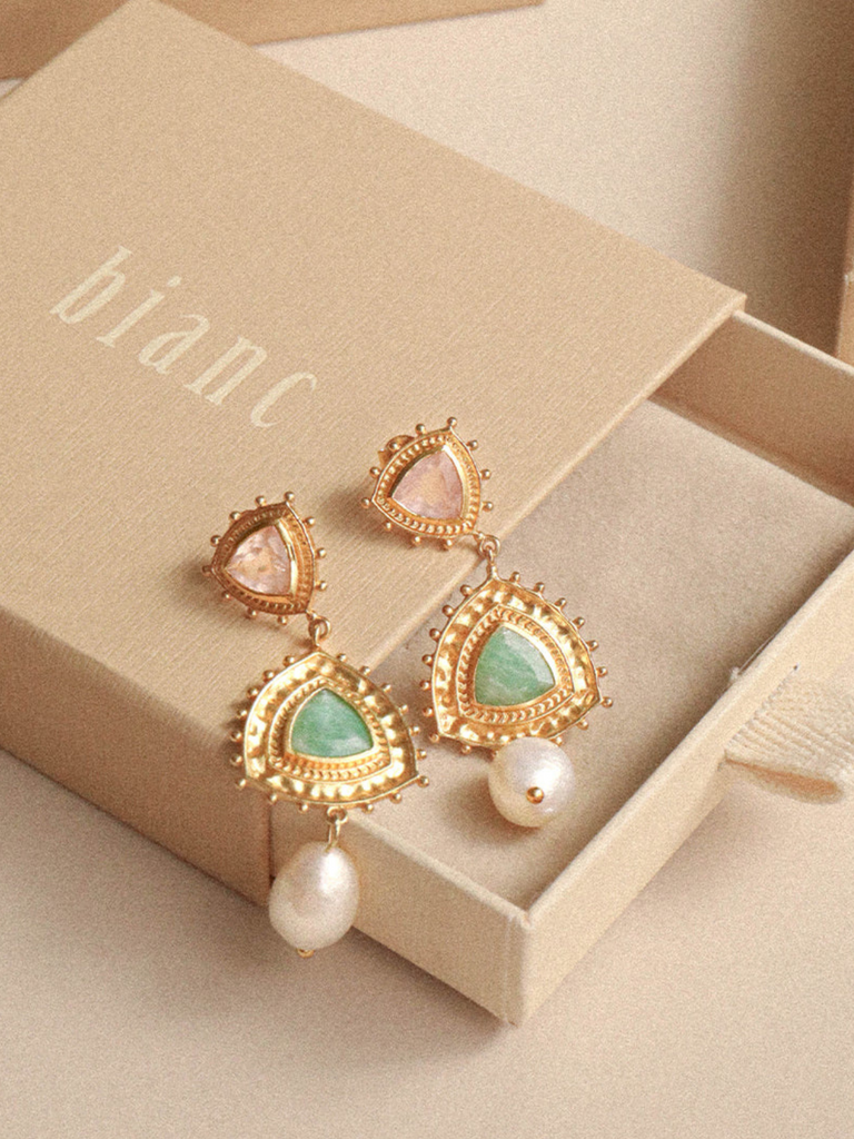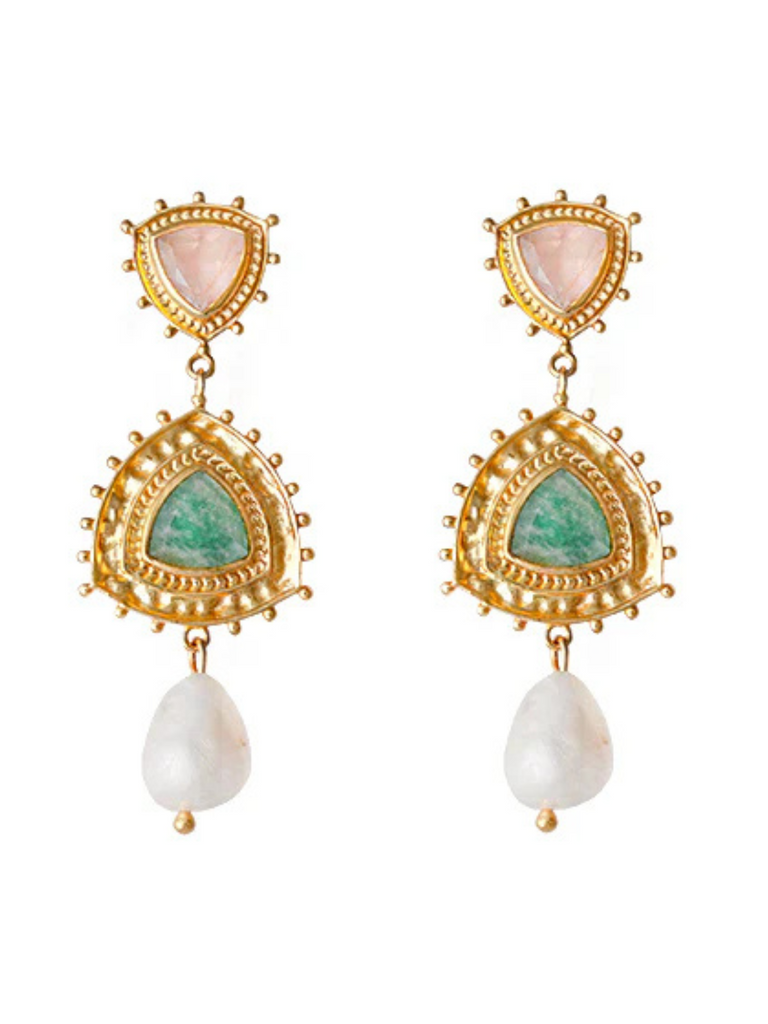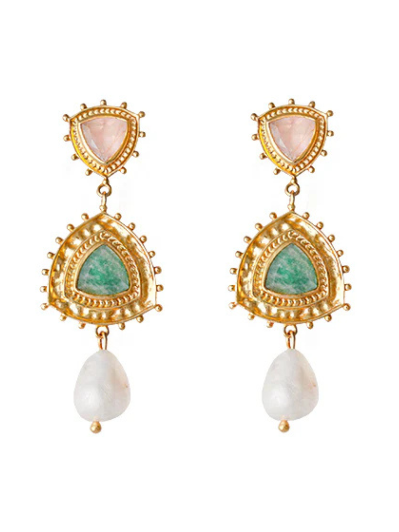 The Ursula Earrings by Bianc feature a statement 18kt gold plated brass design with amazonite and rose quartz cabashion semi-precious stones and freshwater pearls.