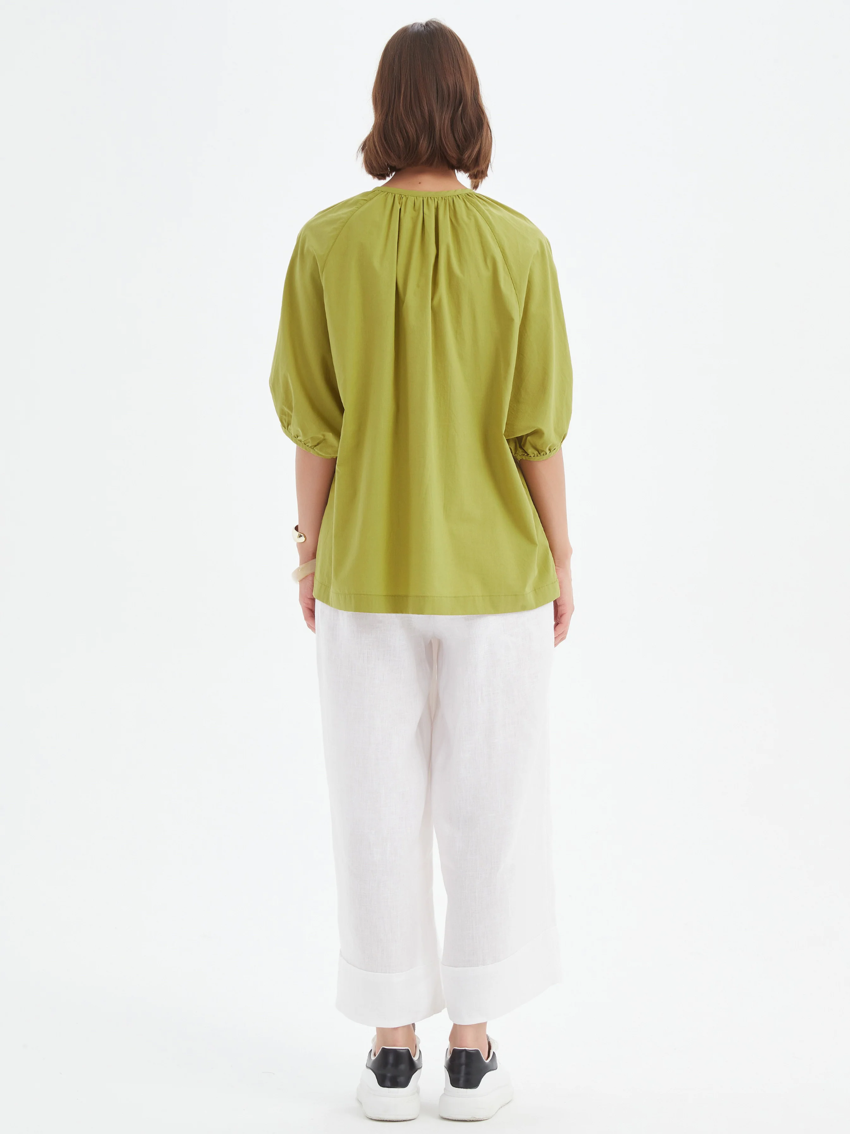 The Gathered Notch Neck Top is a refined staple with subtle detailing. Crafted from a breathable cotton/lyocell poplin blend, it features a notch neck and gathered details across the neckline and puff sleeves, creating volume and ease. Designed in a relaxed fit, this versatile top brings a playful edge to Spring dressing.