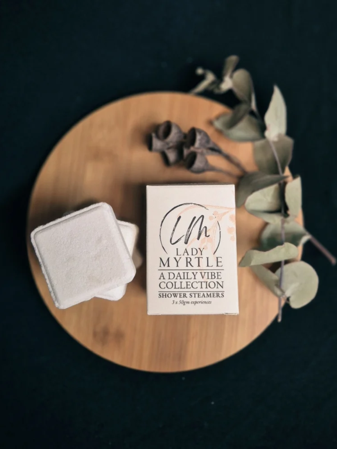 The perfect gift for your loved one, the Lady Myrtle Shower Steamer Gift Set's include 3 of their best-selling shower steamers, meant to provide a mindful moment to escape and allow you to dive deeply within. Crafted by Australian woman Kelly in her effort to share the beauty of Australian scents. Each steamer is 50gm.